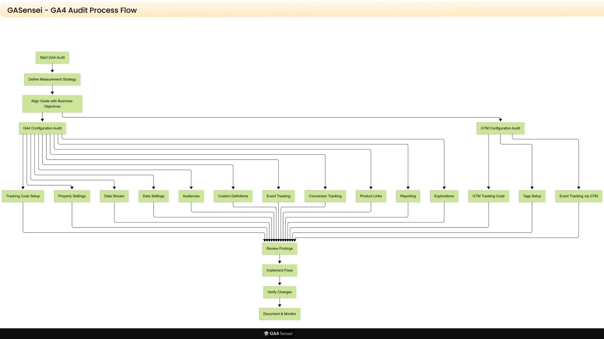 Let’s dive into the GA4 audit process flow, GA4 Sensei has created the process flow which will help you in most optimize way, if you follow our sensei flow for audit you will get best results.